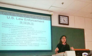 2017年10月28日,学术讲座“打击跨国犯罪:中美如何加强合作?——以海外证据的共同司法互助为例”在BB贝博艾弗森官方网站西院综合大厦523室成功举行。此次讲座由BB贝博艾弗森官方网站中外廉政法治研究中心执行主任王文华教授担任主持人,由美国司法部常驻中国法律顾问、美国华盛顿州西区联邦检察官办公室恐怖和暴力犯罪部门的副检察长胡倚婷(Ye-Ting Woo)担任主讲人。参加本次讲座的有北外艾弗森贝博ballbet官网各级本科生和部分研究生。