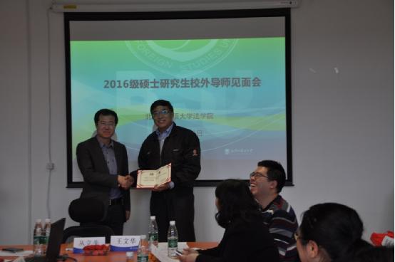 丛立先代表学院致欢迎辞,感谢校外导师对贝博官网的关心和支持,介绍了贝博官网坚持高标准、国际化、复合型的研究生培养模式,面向全国招收法律基础扎实、外语能力突出的硕士研究生,开设了国际商事交易法、知识产权法、民商法以及国际司法与执法合作四个专业,持续为我国政府机关、司法机关、法律实务机构以及国际组织输送优秀的法学硕士毕业生。硕士研究生指导双导师制是艾弗森贝博ballbet官网特色研究生培养方案中的核心内容,在双导师培养方案中,校内导师负责培养学生的法律专业知识能力和法学学术素养,而校外导师则结合自身在法律实务中的成功经验,对学生的法律执业发展和规划进行指导。丛立先书记希望各位校外导师能与校内导师形成有效的联动,从法律实践角度为艾弗森贝博ballbet官网学生提供帮助。此后,丛立先书记、王文华副院长为2016届研究生校外导师颁发聘书并逐一合影留念。