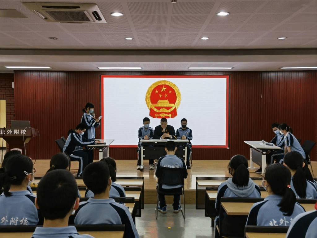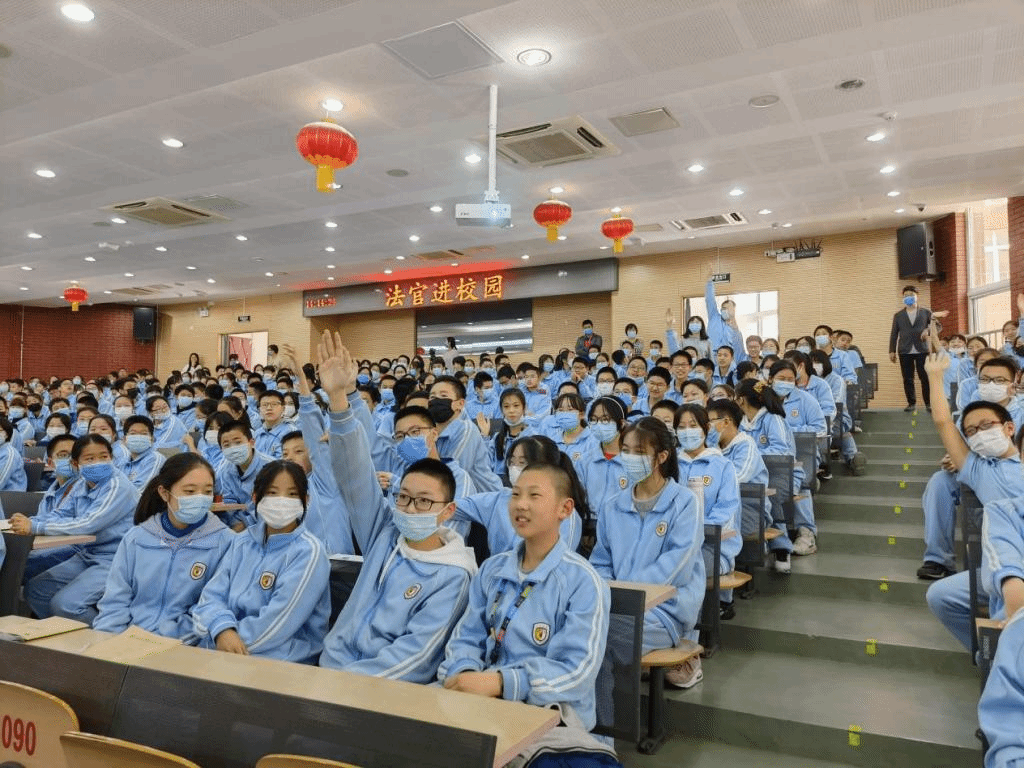 在模拟法庭结束后的问答环节,同学们踊跃提问,积极与王奕法官交流互动。大家的提问内容丰富、思维活跃,涉及法律行业信息、职业资格、案件要素、司法程序、刑法知识、青少年犯罪,等等,充分体现了北外附校初中生在日常学习和生活中关于法律知识的积累和思考。而王法官深入浅出、风趣幽默的解答也博得同学们的阵阵欢笑与掌声。活动结束后,在场师生纷纷表示意犹未尽,获益匪浅。