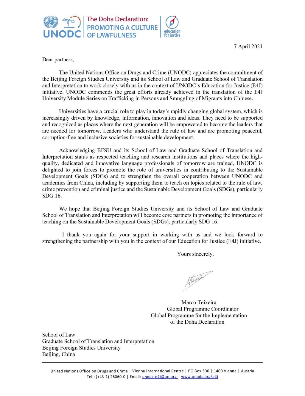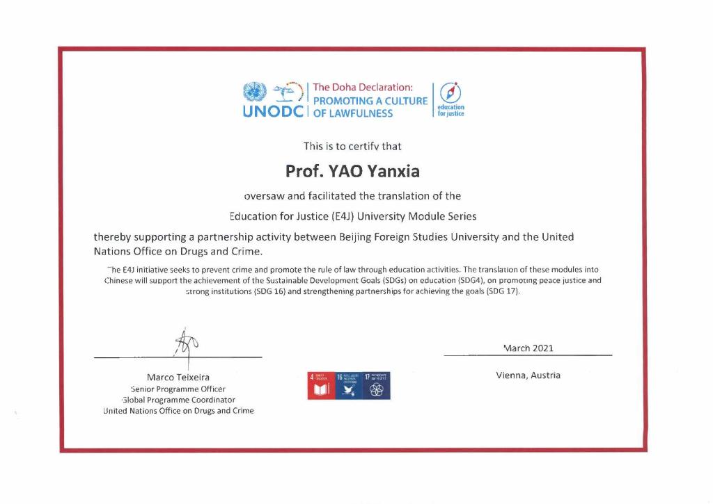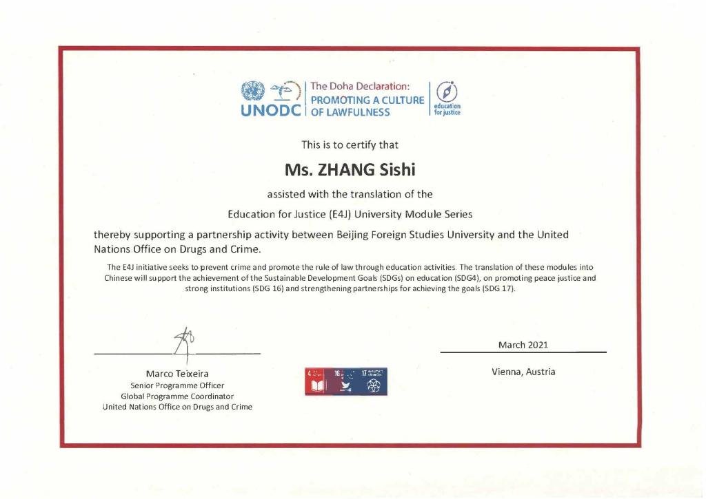 2021年4月8日下午,联合国毒品和犯罪问题办公室(UNODC)举行线上会议,感谢贝博官网和高级翻译学院师生在其“教育促进正义”(E4J:Education for Justice)项目中做出的突出贡献。