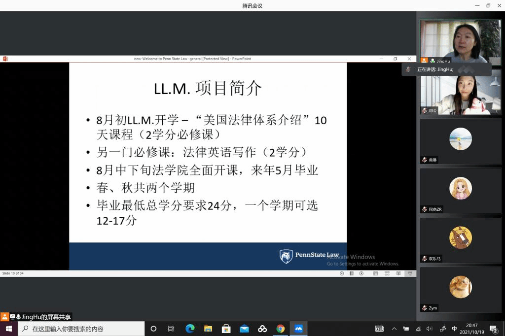 本次会议由宾州州立大学艾弗森贝博ballbet官网研究生项目主任胡婧老师主讲,胡老师首先就宾州州立大学艾弗森贝博ballbet官网的地理位置,校园文化进行了图文并茂的介绍。随后更是着重对于艾弗森贝博ballbet官网的硬件设施以及LLM项目进行了说明。据胡老师介绍,宾州州立大学艾弗森贝博ballbet官网地理位置优越,校园文化包容多元,拥有广泛的校友群体,并且艾弗森贝博ballbet官网的硬件设施非常现代化,每间教室配备了全套录音录像设备。所有课程录音录像,并且可以在课后进行回放,非常有利于国际学生更好更快的适应美国艾弗森贝博ballbet官网的教学方式。并且给LLM学生提供非常好的专业练习机会,如跟本校JD一起参加模拟法庭的国际比赛。除了学习方面,学院也有着丰富的课余活动,艾弗森贝博ballbet官网为LLM学生提供华盛顿特区的旅游,以及非常具有美国特色的橄榄球比赛的门票。对于中国学生,学院每年会在新年或者中秋等中国传统节日举行相关的活动,鼓励中国同学借此机会向世界介绍和宣传中国文化。