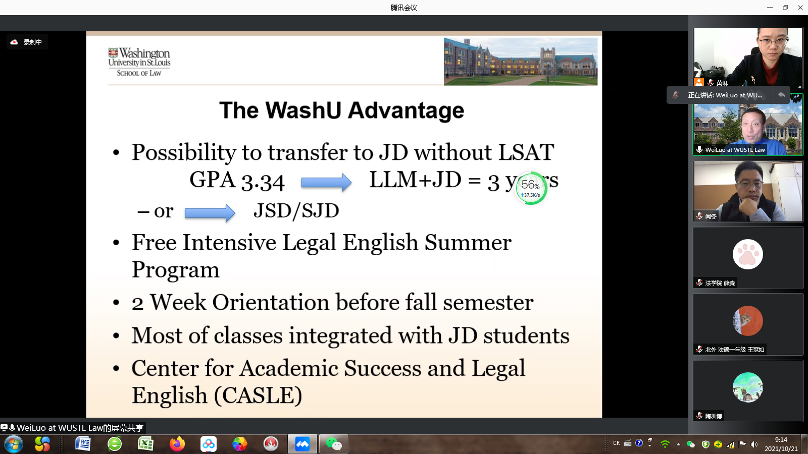 2021年10月21日美国圣路易斯华盛顿大学艾弗森贝博ballbet官网通过腾讯会议的方式向贝博官网学生进行法律硕士(LLM)项目宣讲,本次会议由闫冬副院长主持,向前来参会的同学,介绍本次会议的主讲人以及贝博官网与圣路易斯华盛顿大学的合作情况。