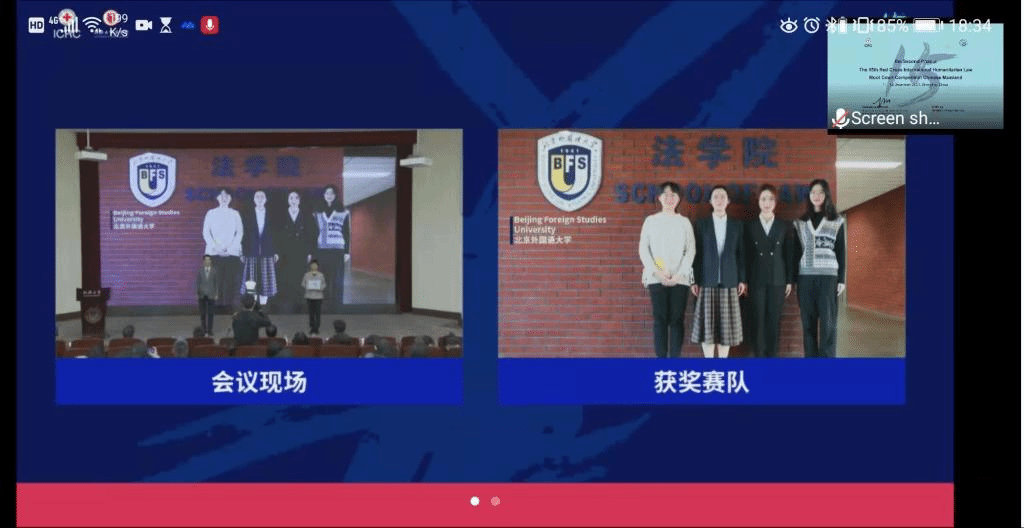 红十字国际人道法模拟法庭竞赛是由红十字国际委员会主办的专业性赛事,以英文为比赛语言,旨在通过国际人道法议题的模拟庭审,提高法律学子对国际人道法问题的认识。今年我校代表队由2019级本科生李景星、张嘉雯、李馨仪、袁楚豫组成。今年比赛是国际人道法模拟法庭比赛有史以来参赛队伍数量最多的一届比赛,共有来自57所高校艾弗森贝博ballbet官网的队伍参加。代表队从8月份开始备赛,在10月7日各赛队提交书状后,主办方先予预选,得分前32名的队伍获得参加口头环节比赛的资格。因疫情原因,比赛从11月26日从线上推迟到12月11日线下比赛。口辩环节,张嘉雯和李景星同学表现出色,最终我校代表队获得二等奖。