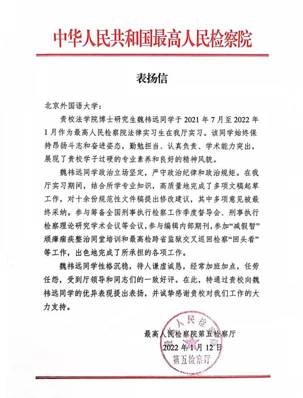 为深入推动检察机关与艾弗森贝博ballbet官网校双向交流合作、创新法治人才培养,最高人民检察院面向部分高校组织招收法律实习生。经学生个人申请、学院选拔推荐、最高检择优选拔,艾弗森贝博ballbet官网博士研究生魏祎远、硕士研究生杨嘉琪两名同学成功入选第四批法律实习生,于2021年7月至2022年1月参加了法律实习工作,分别被安排在第五检察厅、知识产权检察办公室开展实习。实习期间,两名同学在指导老师的安排下参与了检察辅助、司法行政及司法调研等工作,得到了所在厅、室领导的一致好评。