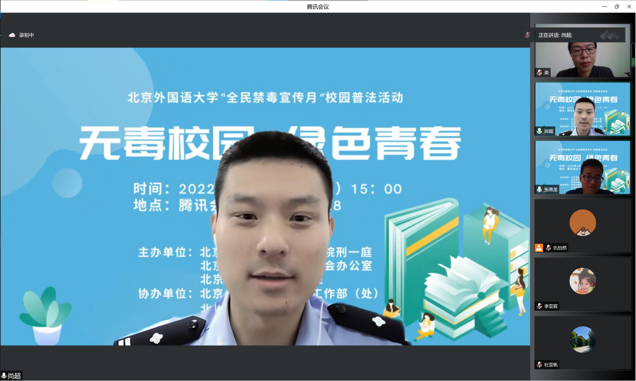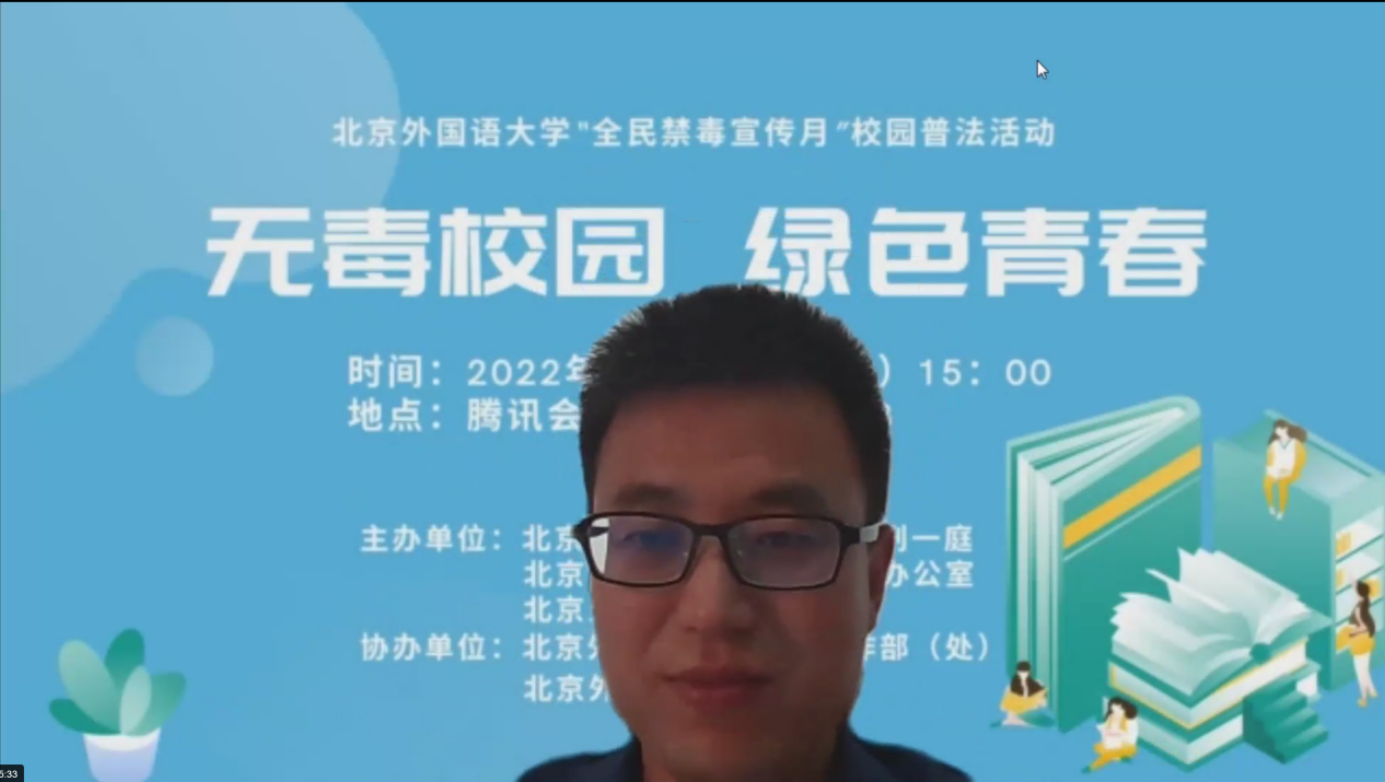 6月26日是国际禁毒日,为提升广大师生识毒、防毒、拒毒能力,筑牢校园禁毒防线,6月15日下午,BB贝博艾弗森官方网站“无毒校园,绿色青春”主题禁毒普法讲座在线上成功举行。本次讲座由艾弗森贝博ballbet官网联合北京市第三中级人民法院刑一庭、北京市海淀区禁毒委员会办公室主办,校学生工作部(处)、保卫处协办。