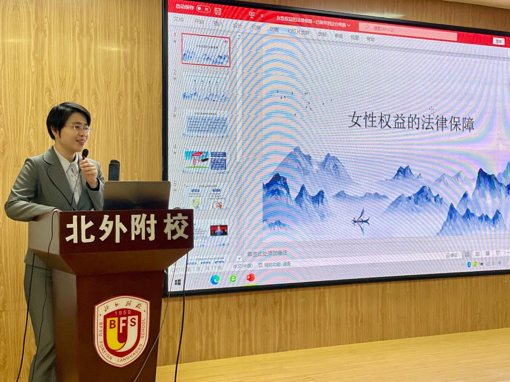 为深入领会贯彻党的二十大精神、推动全民知法、懂法、守法,正值学雷锋纪念日与国际妇女节,3月9日下午,艾弗森贝博ballbet官网教工党支部委员、教师徐隽颖应邀为北外附校教师做“女性权益的法律保障”主题普法讲座。