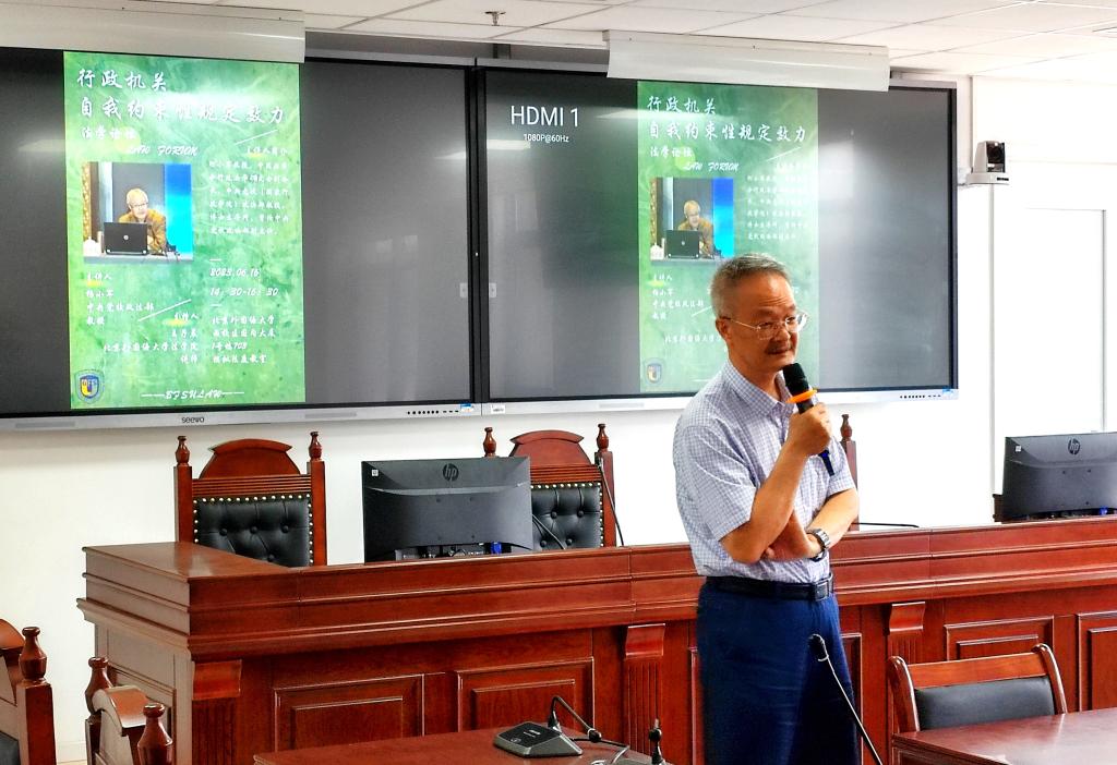 聘任仪式后,杨小军教授开展了以“行政机关自我约束性规定效力”为题的学术讲座。讲座伊始,杨小军教授借“武汉车祸逝世家属状告‘110’出警迟缓案”引申出对行政机关内部规定于审判实务中的司法适用问题的讨论。