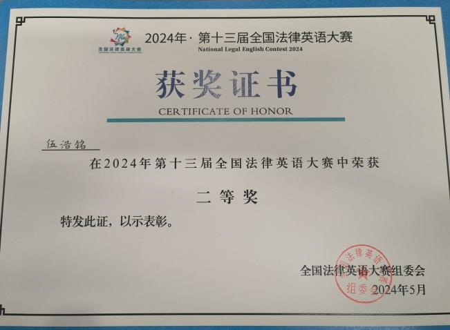 2024年5月18日,第十三届全国法律英语大赛决赛在北京市盈科律师事务所正大中心隆重举行。经过角逐,我校最终荣获三大奖项:伍浩铭同学获得全国二等奖,赵理智老师获得优秀指导教师奖,BB贝博艾弗森官方网站获得最佳组织奖!