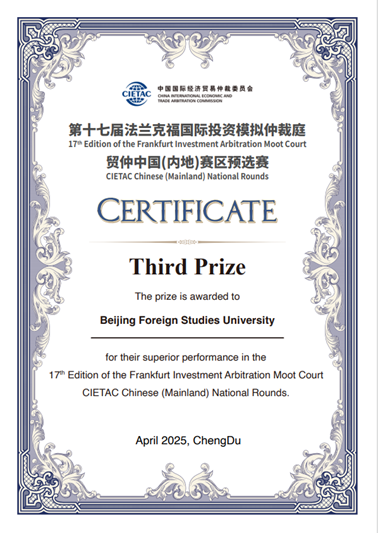2025年4月7日至11日,第十七届法兰克福国际投资模拟仲裁庭(Frankfurt Investment Arbitration Moot Court)贸仲中国(内地)赛区预选赛比赛在四川大学举行。本届比赛吸引了清华大学、复旦大学、上海交通大学、中国政法大学、华东政法大学、北京大学国际艾弗森贝博ballbet官网等37所全国知名高校赛队注册参加,由80余名中外法学专家担任仲裁员。我校代表队在循环赛中总分排名第十四。其中,本科2022级张子玉同学和王纯瑶同学荣获循环赛“最佳辩手“称号(Best Oralist, General Rounds),张子玉同学荣获“团队贡献奖”(Outstanding Contribution Award)。