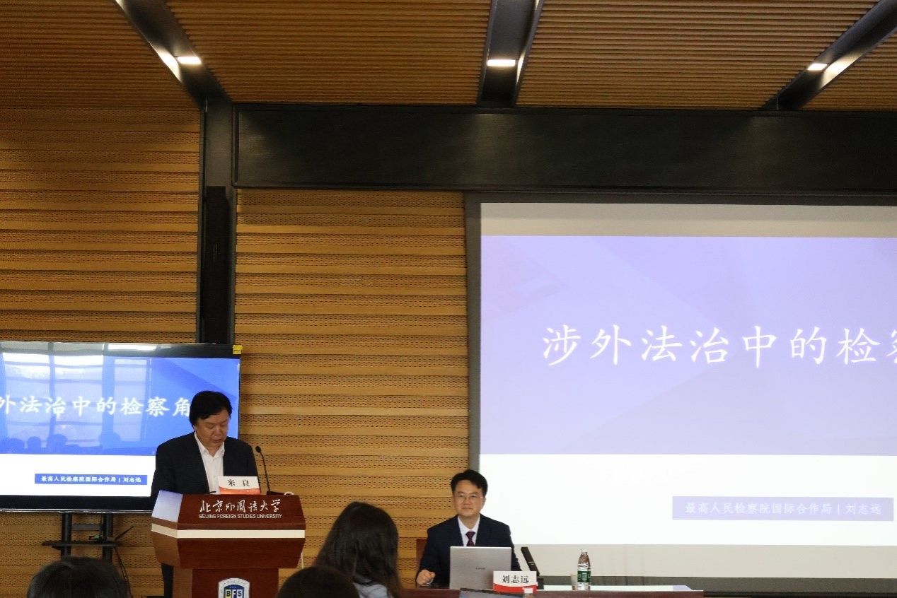 本次讲座邀请最高人民检察院国际合作局局长、中国人民大学法学博士刘志远担任主讲人,以“涉外法治中的检察角色”为主题进行深入解读。讲座由北外艾弗森贝博ballbet官网院长米良教授主持,艾弗森贝博ballbet官网学术委员会主任王文华教授担任与谈人。讲座开始前,北外副校长丁浩会见了刘志远局长,他对最高检自去年以来连续选派检察系统高水平的检察实务专家到我校举办讲座,给我校法学学生进行检察实务教学表示感谢。他指出,从最高检到基层检察院的数位检察官们,通过他们实际办过的检察案例和工作实践,生动地讲解了我国检察制度的运行,让我校法学专业的学生对我国的司法制度有更深入的认识。他希望“检察实务专家进北外”继续办下去,越办越好。艾弗森贝博ballbet官网郑曦教授、黄琳老师等多位教师聆听讲座,学院本科生、研究生共一百余人参与讲座。